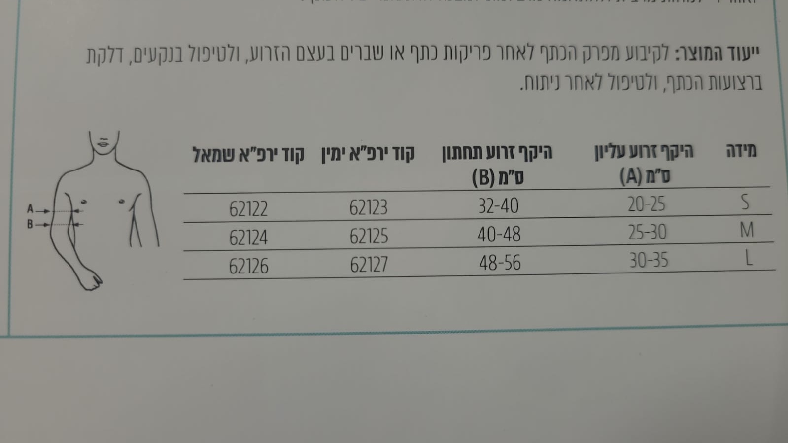 מקבע מפרק כתף לארג' – היקף זרוע עליון: 30-35ס"מ, היקף זרוע תחתון 48-56ס"מ, מקבע מפרק כתף מדיום – היקף זרוע עליון: 25-30ס"מ, היקף זרוע תחתון 40-48ס"מ, מקבע מפרק כתף סמול – היקף זרוע עליון: 20-25ס"מ, היקף זרוע תחתון 32-40ס"מ